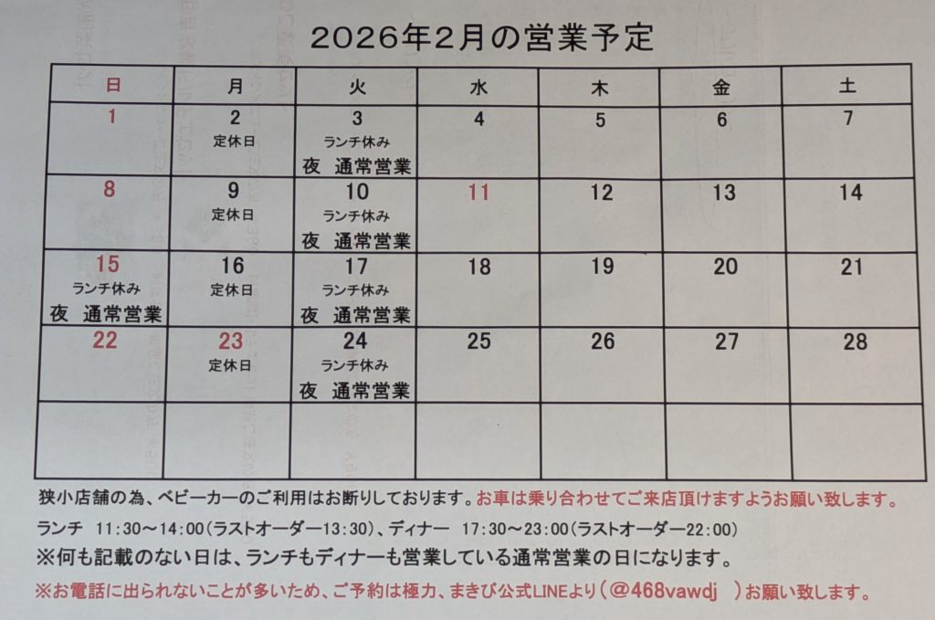 2月の営業予定表を添付致します。また、奥のテーブル席をプチリューアル致しましたので、併せてご連絡申し上げます。6名様以上のお客様に対しましては利便性がかなり良くなったと思います!あまり人気の無かった木のベンチも無くなりましたので、おしりも痛くならないと思います(笑)。