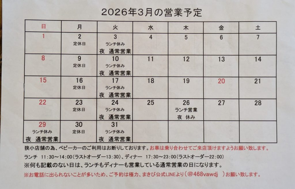 すいません、3月の営業予定表が添付されていませんでした。今更ではございますが、下記に添付させて頂きます。